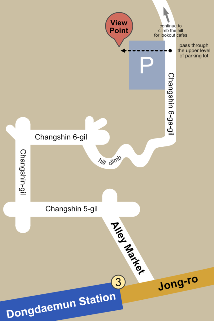 To reach the quarry and cafés, walk through the market and follow Changsin 6-ga-gil uphill. About halfway up, you’ll see a public parking lot. Behind it, a small staircase leads to the quarry cliff viewpoint. After taking in the view, backtrack and continue climbing to the top of the hill, where you’ll find several cafés overlooking the city.
